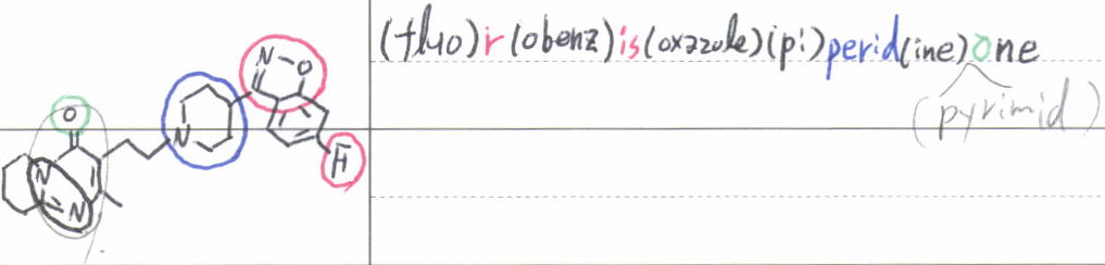 Risperidone: (fluo)r(obenz)is(oxazole)(pi)perid(ine)(pyrimid)one