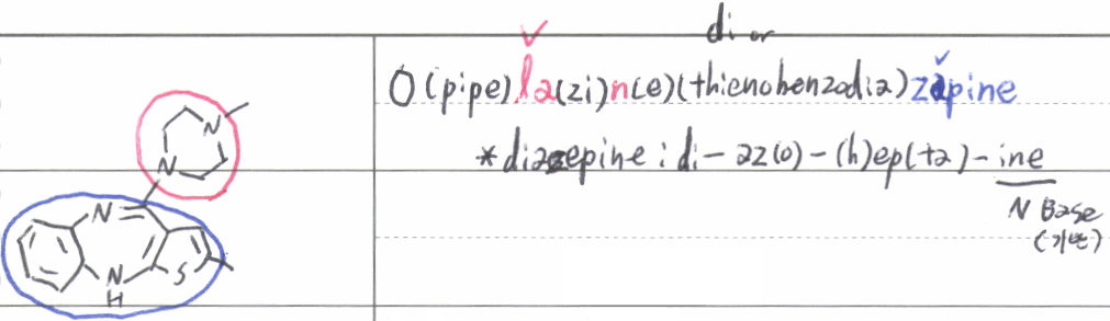 맨 앞의 O는 출처가 불분명하다. 그러나 thienobenzodiazepine에 달린 잔기가 1-methylpiperazine이므로 맨 앞의 one의 O일 것이라는게 높은 확률로 추측이 된다.