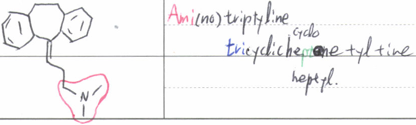 또한 모핵이 되는 heptane 링에서 pt를 따온 뒤 이를 모핵을 잔기로 보고 잔기에 붙이는 어미인 yl과 질소가 들어간 화합물에 붙은 어미인 ine을 붙여서 최종적으로 amitryptyline을 만들어 내었다.