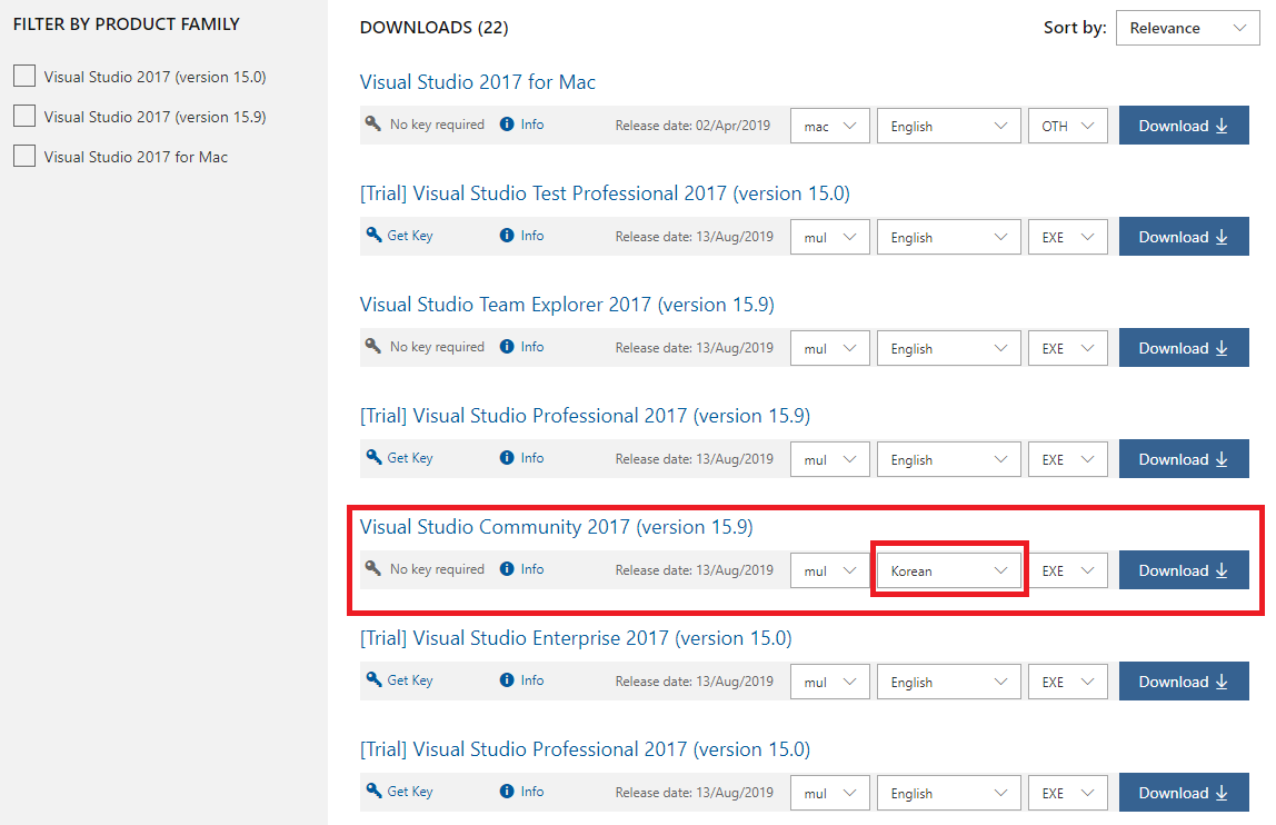 4) 그러면 아래와 같이 여러 다운로드 항목이 있을 텐데, 여기서 Visual Studio Community 2017 / Korean / EXE를 선택하고 옆에 다운로드를 눌러준다.