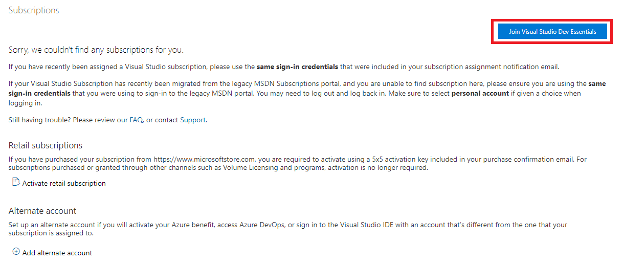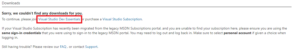 3) 눌렀을 때 "죄송합니다. 다운로드 항목을 찾을 수 없습니다.(Sorry, we couldn't find any downloads for you.)"라는 메시지가 나오면 Visual Studio Dev Essentials에 가입되지 않은 상태라 다운로드를 받을 수 없는 상태이다.