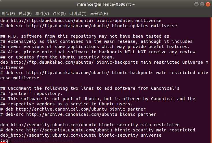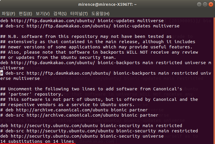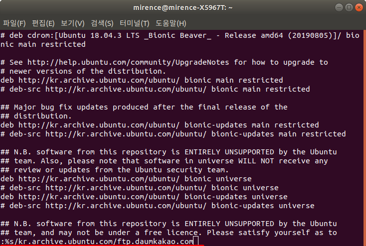 여기에서 %s/kr.archive.ubuntu.com/ftp.daumkakao.com을 입력해주시고 엔터를 치시면