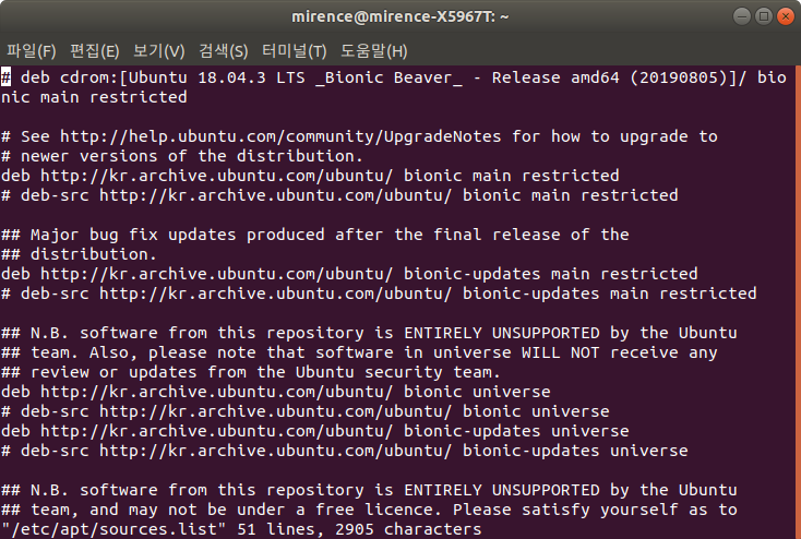 명령어 입력시 sources.list파일이 열립니다.