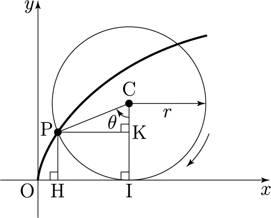 그럼 x는? 원이 t만큼 돌아갔을 때 원의 중심이 x축으로 이동한 거리는, 그 호의 길이와 같다. 왜냐고? 바닥에 원 둘레를 딱 붙이고 돌아갔을테니까!(위 그림에서 $ \overline{OI} = \overset{\mmlToken{mo}{⏜}}{\rm PI} $)