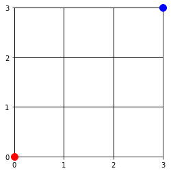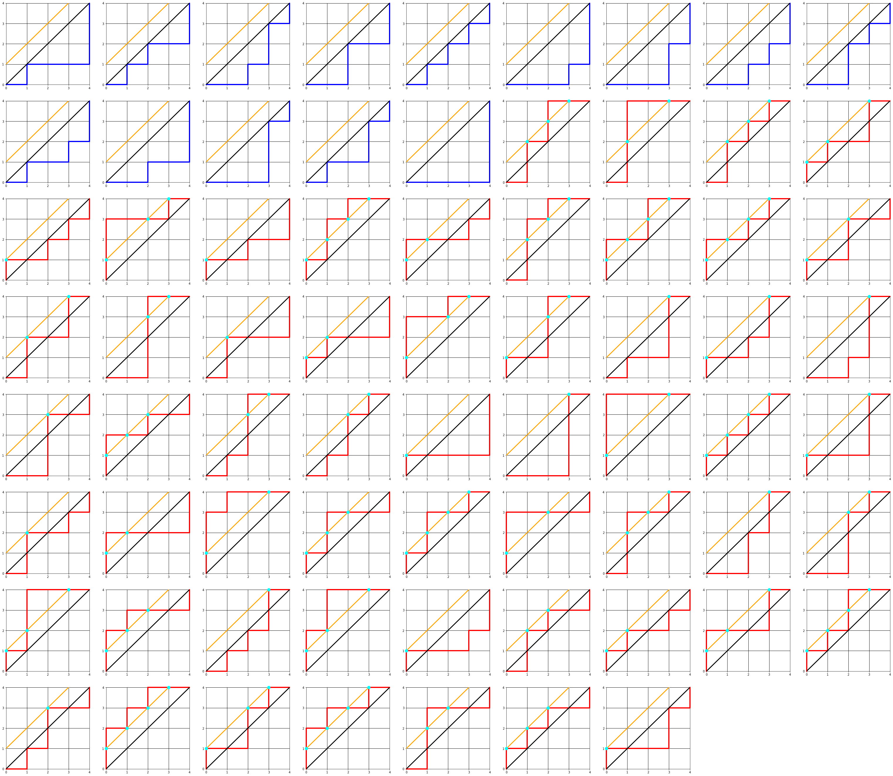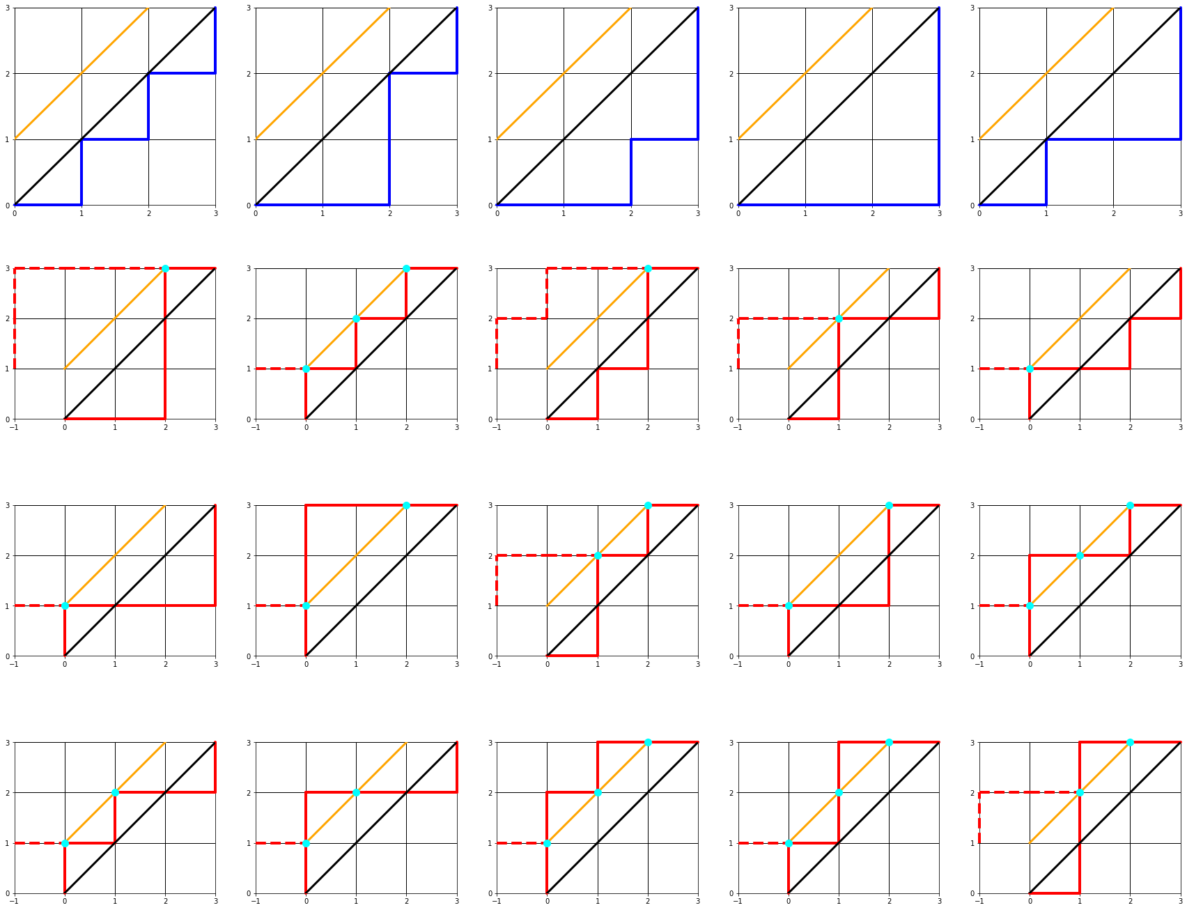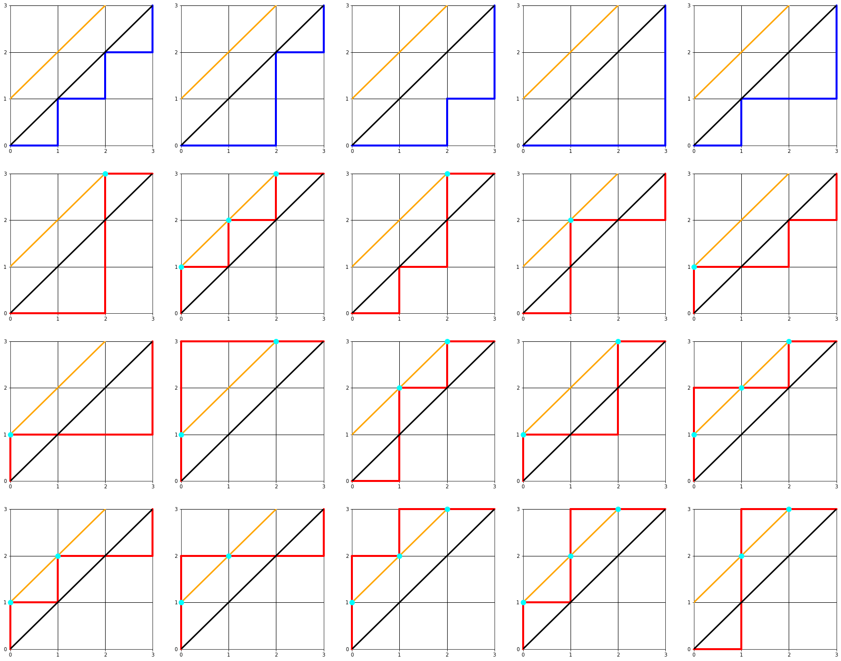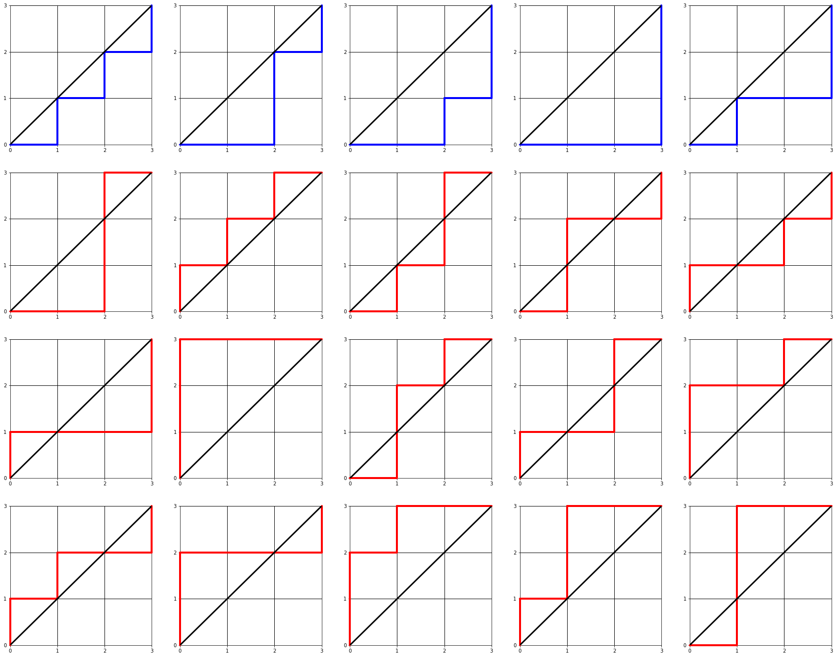 n=2는 너무 간단하니까 n=3으로해서 모든 경로를 그리고, 여기서 카탈란 수 조건에 맞는 경로는 파란색으로, 위반한 경우는 빨간색으로 그려보겠습니다.
