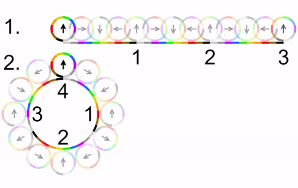 그러나 원형 경로를 따라 회전하면 자신의 회전 중심 또한 회전하게 되므로 추가적인 회전이 더해집니다.