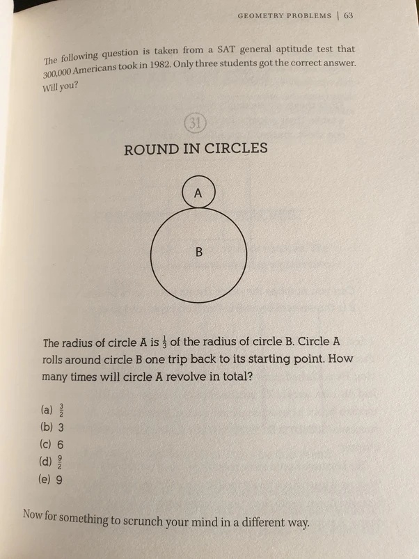 출제자를 포함하여 모든 사람들은 그냥 '원 B의 반지름보다 원 A가 1/3배 작으니까, 세번 돌았겠지?'하고 (B)를 골랐으나...