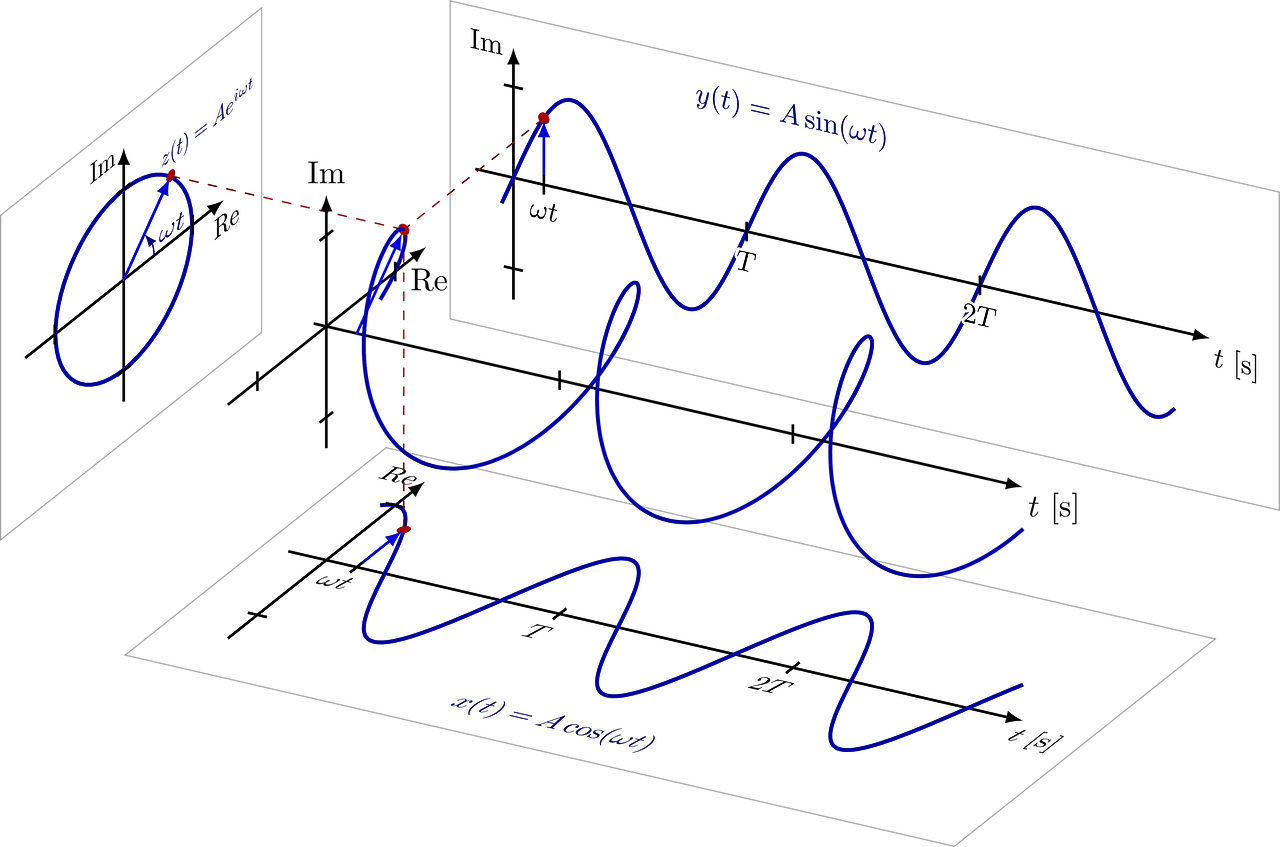 이 복소수 운동이 나선형으로 전개되며 실수부와 허수부가 시간에 따라 각각 사인과 코사인 파형으로 나타나는 구조를 가집니다.