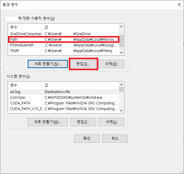 4) "환경 변수" 창에서 "새로 만들기" 위에 리스트에서 "Path"라고 적힌 부분을 찾아서 "편집" 클릭