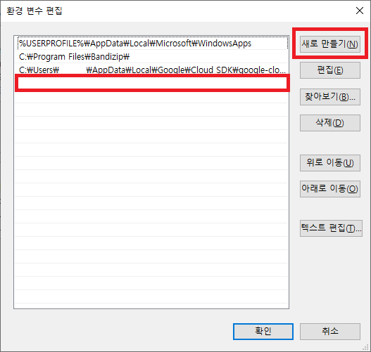 5) 환경변수 편집 창에서 새로만들기 누른 후