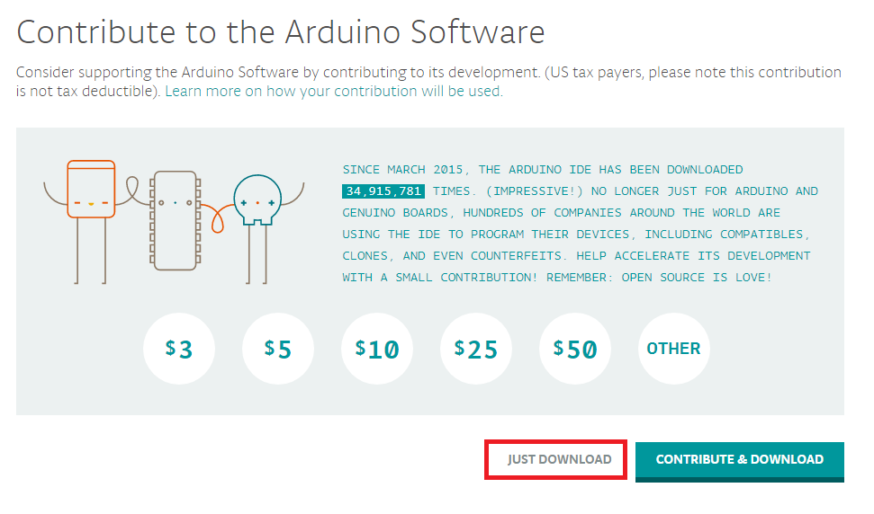 2> 기부창이 뜹니다. 저희가 돈이 많다면 아두이노에 기부를 해줄테지만.. 일단은 JUDT DOWNLOAD를 눌러 그냥 다운로드를 진행해줍니다! 다운로드 파일 선택창이 뜨고(이 곳을 잘 기억해주세요!) 저장 버튼을 누르면 바로 다운로드가 시작됩니다!