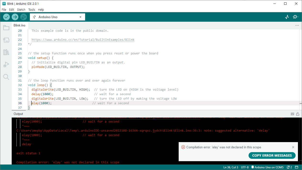 만약에 에러가 발생하면(저는 일부러 delay함수에서 d를 지워보았습니다) 아래쪽에 빨간글씨가 뜨면서 어디가 에러가 발생했는지 알려주죠!