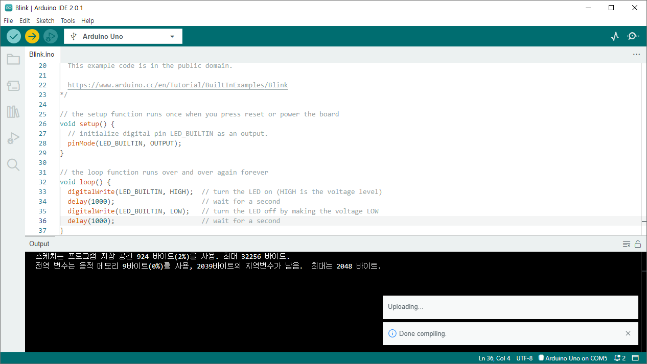 이 업로드 버튼을 누르면 이 소스코드가 실행파일 형태로 바뀌어서 아두이노 보드로 보내지고, 잠시 기다리면 아두이노 보드의 주황색 불빛이 깜빡거리는 걸 보실 수 있습니다!