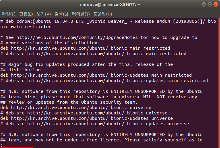 명령어 입력시 sources.list파일이 열립니다.